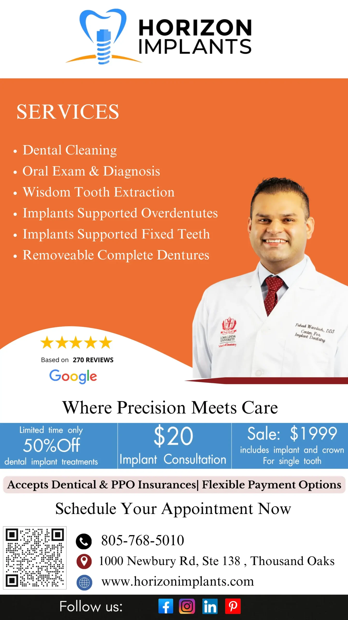 Welcome to Horizon Implants, a leading Dental Clinic in Thousand Oaks focused on Restorative Dentistry and Dental Implants. Under the leadership of Dr. Fahad Warraich, our specialised clinic offers superb and affordable dental implants, ranging from complex full-mouth reconstruction and bone grafting treatments to single-tooth replacements.